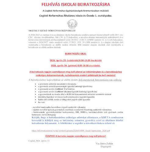 Kőröstetétleni Iskola Iskolai beiratkozás 2026.04.15. Tovább Iskolagyümölcs program 2026.04.14. Tovább Sajtóközlemény 2026.01.08. Tovább Suliváró 2025 2025.10.16. Tovább Előzetes jelentkezési lap 2025.10.16. Tovább Mentális Egészség hete 2025.05.07. Tovább